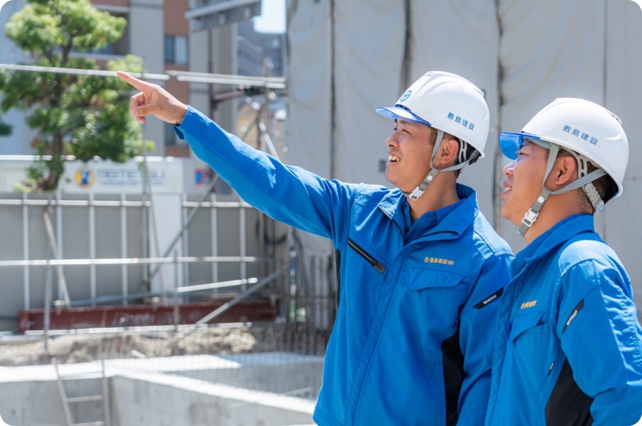 建設工事現場で、工事の進捗管理をおこないます。職人や一人親方を含め、現場で作業する大勢の人をまとめるため、全体を引っ張っていくリーダーシップが求められますが、多分野の専門家と連携して仕事を進めるため、知識の幅も自然と広がっていきます。